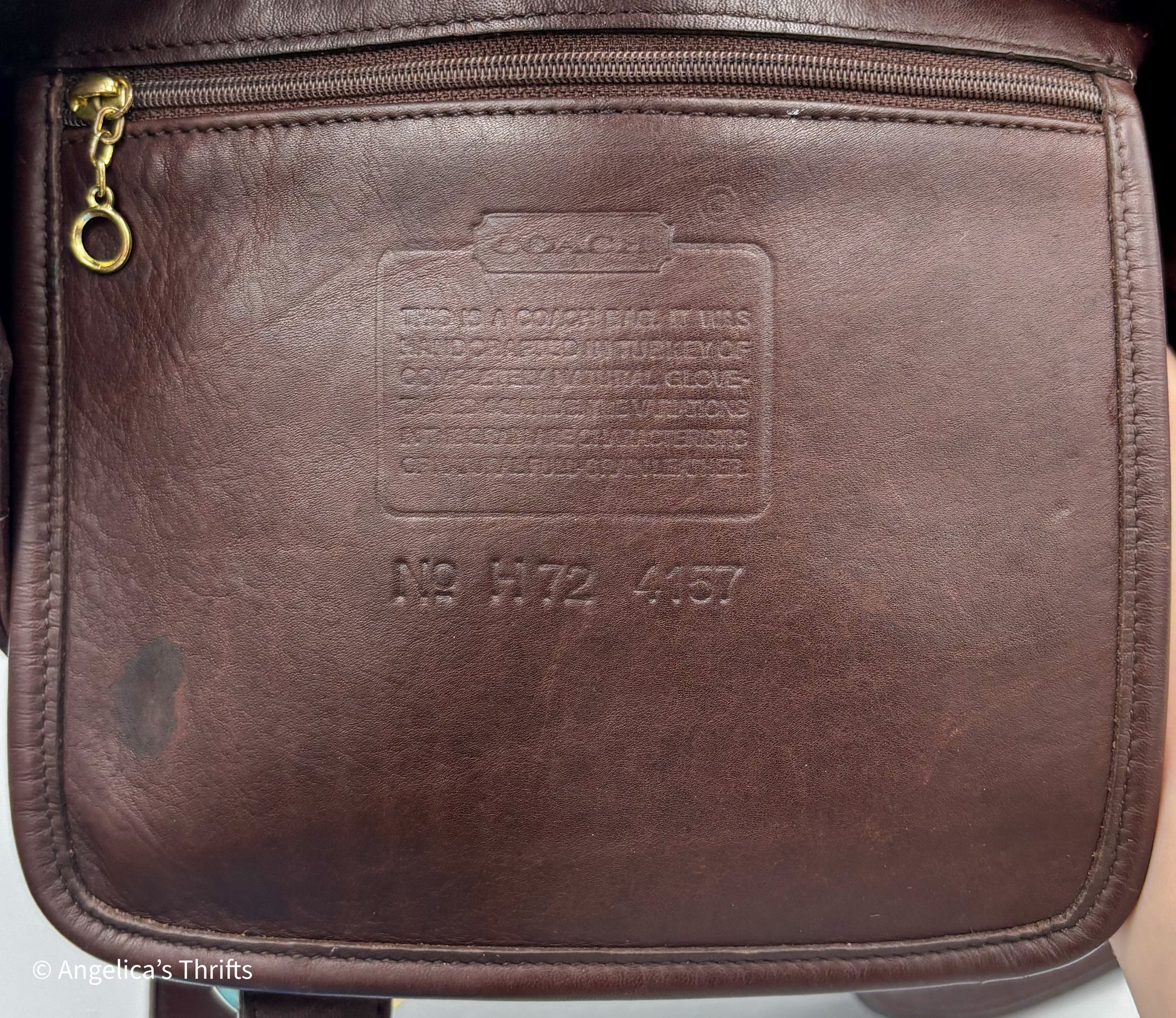 The bag opens to a leather interior with a zip pocket for everyday organization. The leather shows natural patina from age, along with a small ink mark on the creed and a few subtle ink marks on the exterior, all consistent with gentle vintage use. The structure remains solid, with original brass hardware and a sturdy base that helps the bag hold its shape.