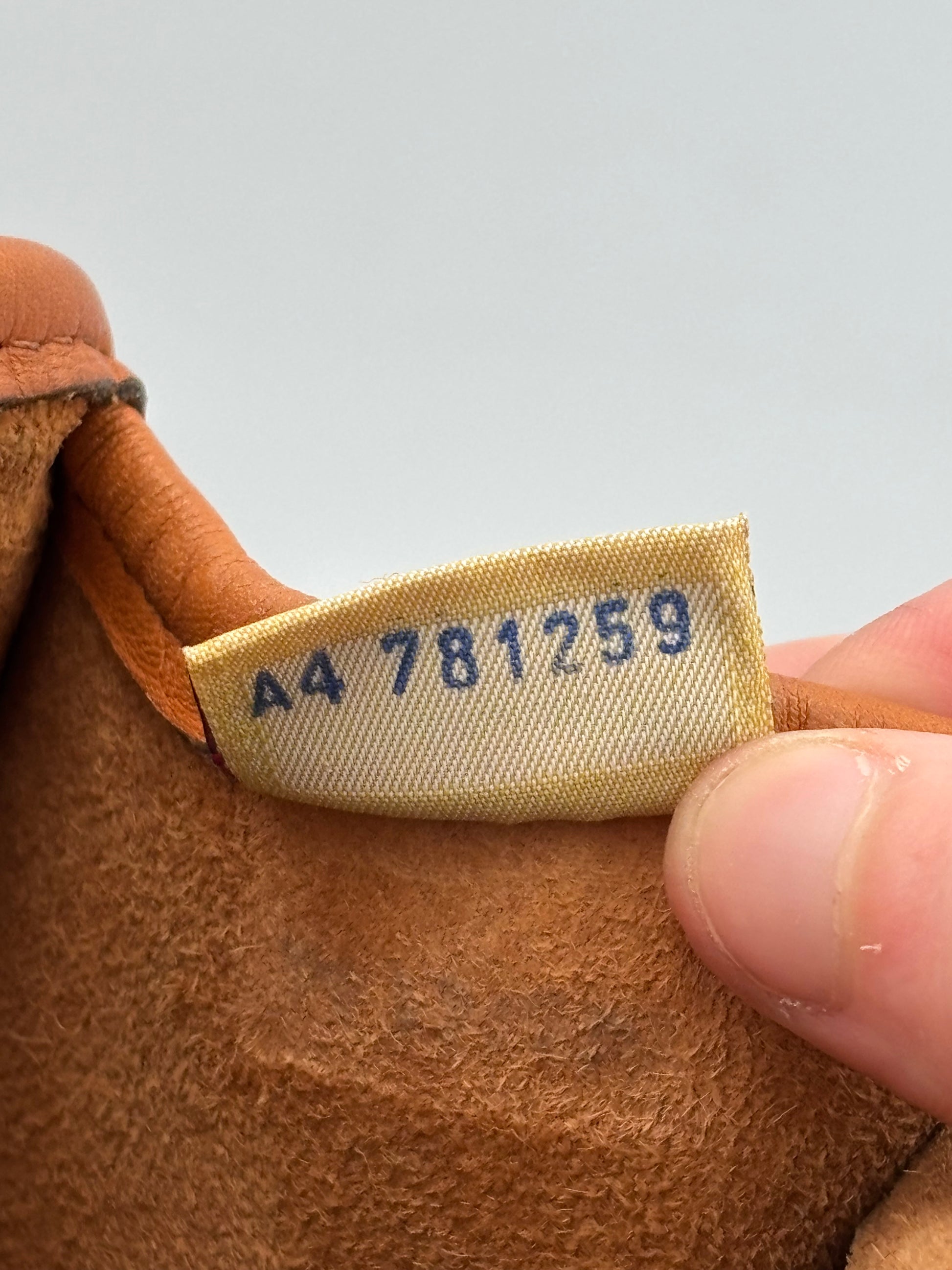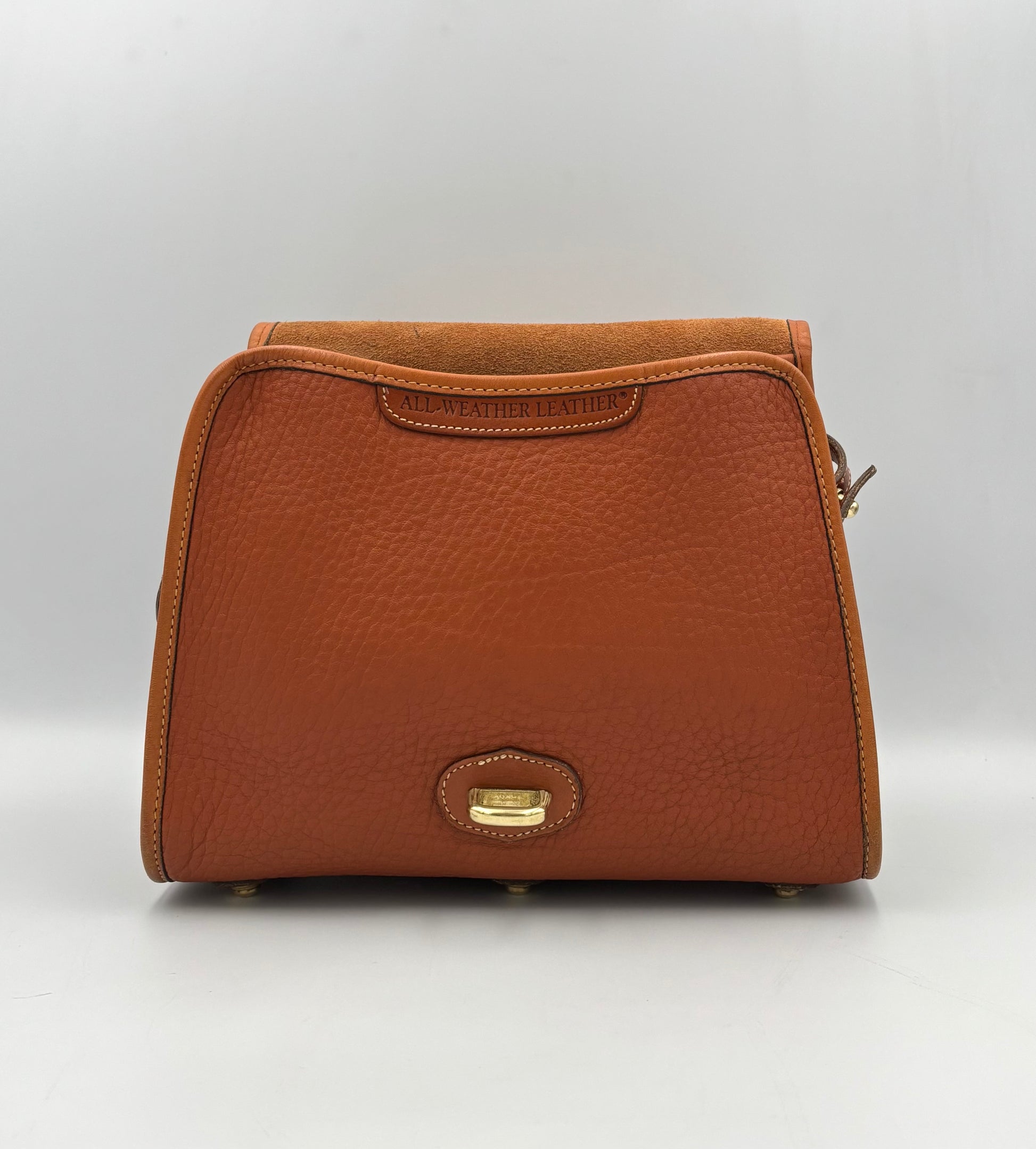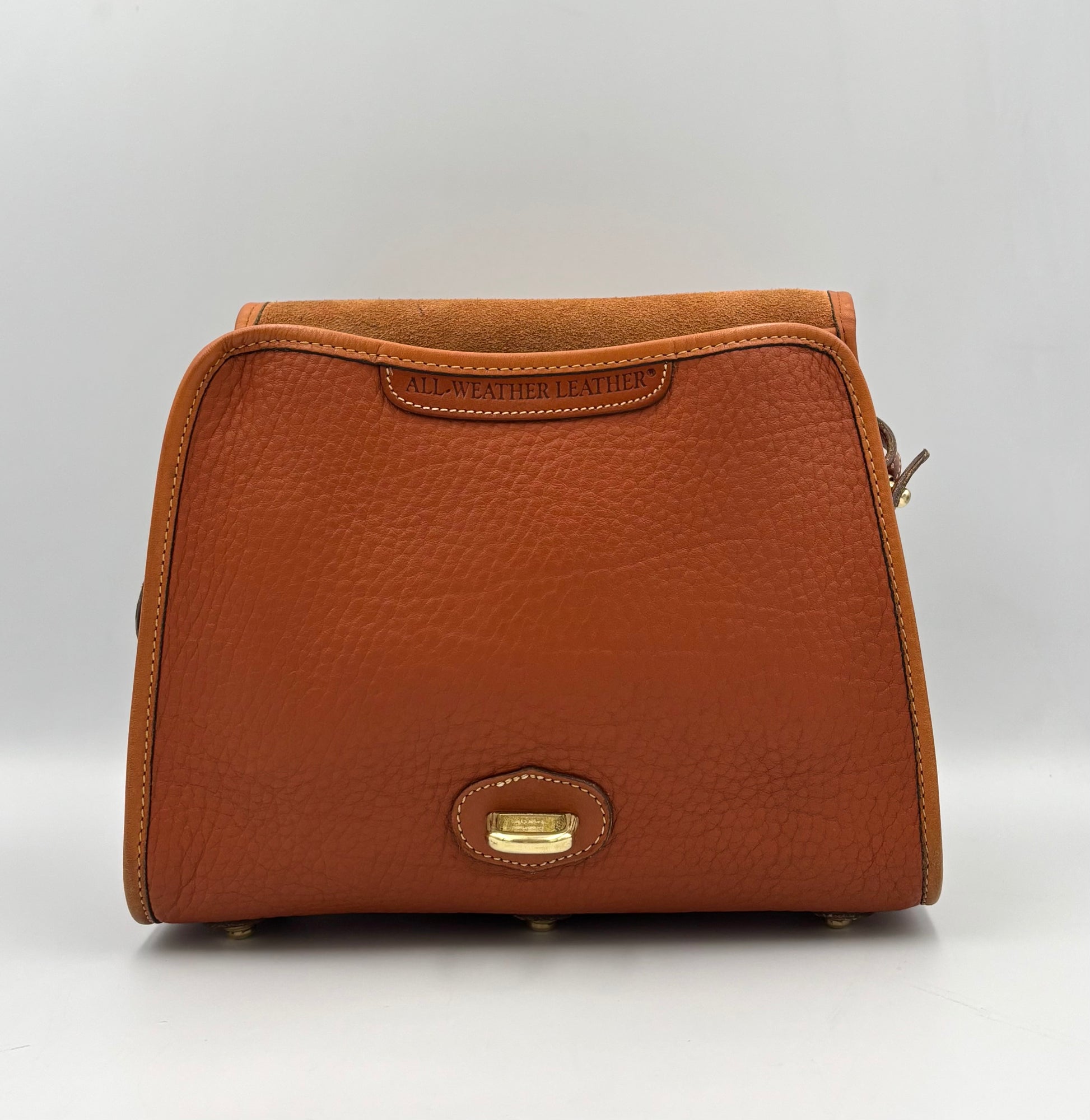 The flap secures with a tack closure — a leather tab that fits securely through a fixed loop. The interior is raw suede with one zip pocket and a sewn-in Dooney & Bourke tag. A back slip pocket offers easy-access storage. Overall excellent vintage condition with light wear to the trim and brass, a clean interior, and strong structure. Serial number A4 781259 confirms authenticity. Made in the USA.