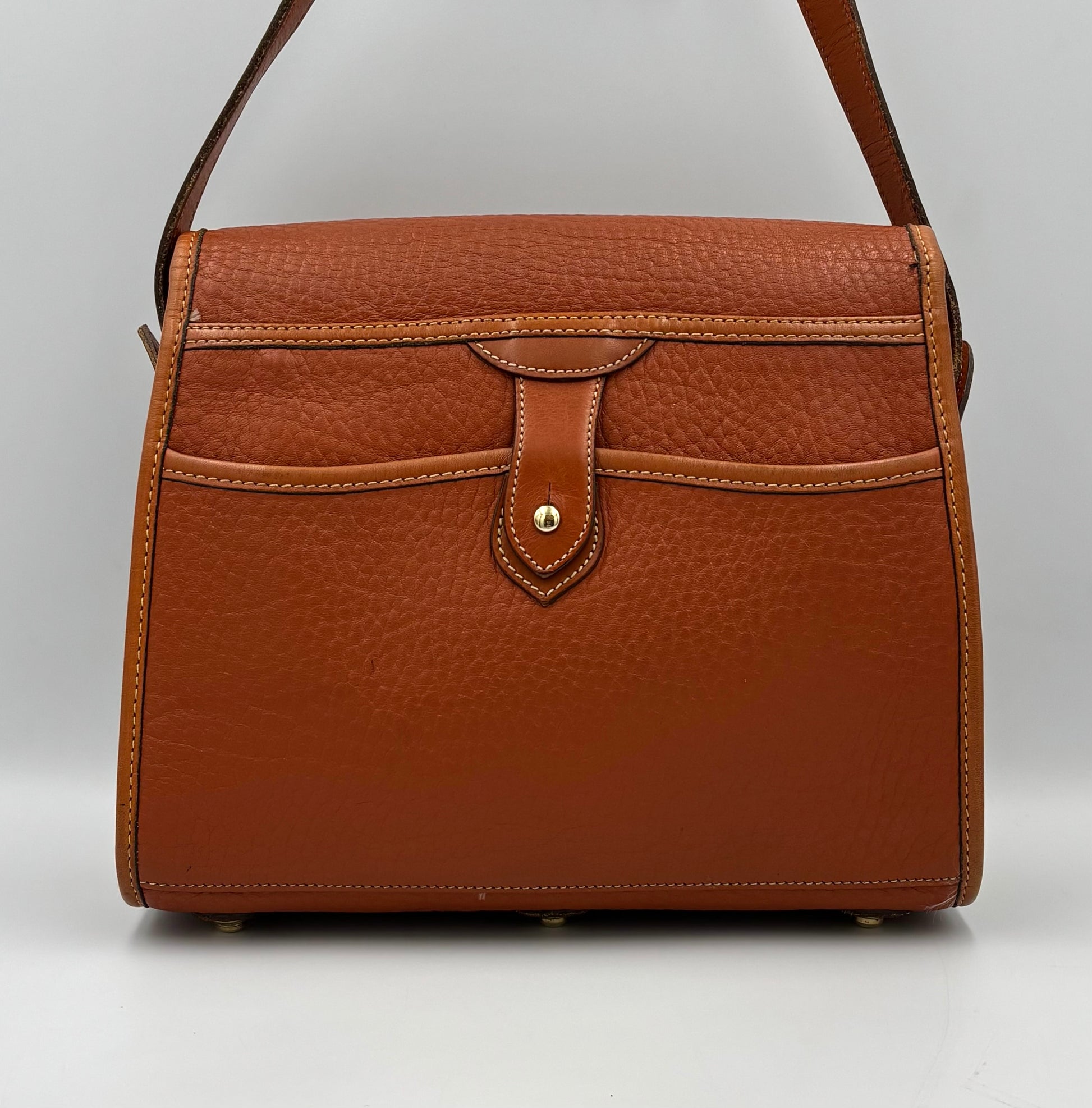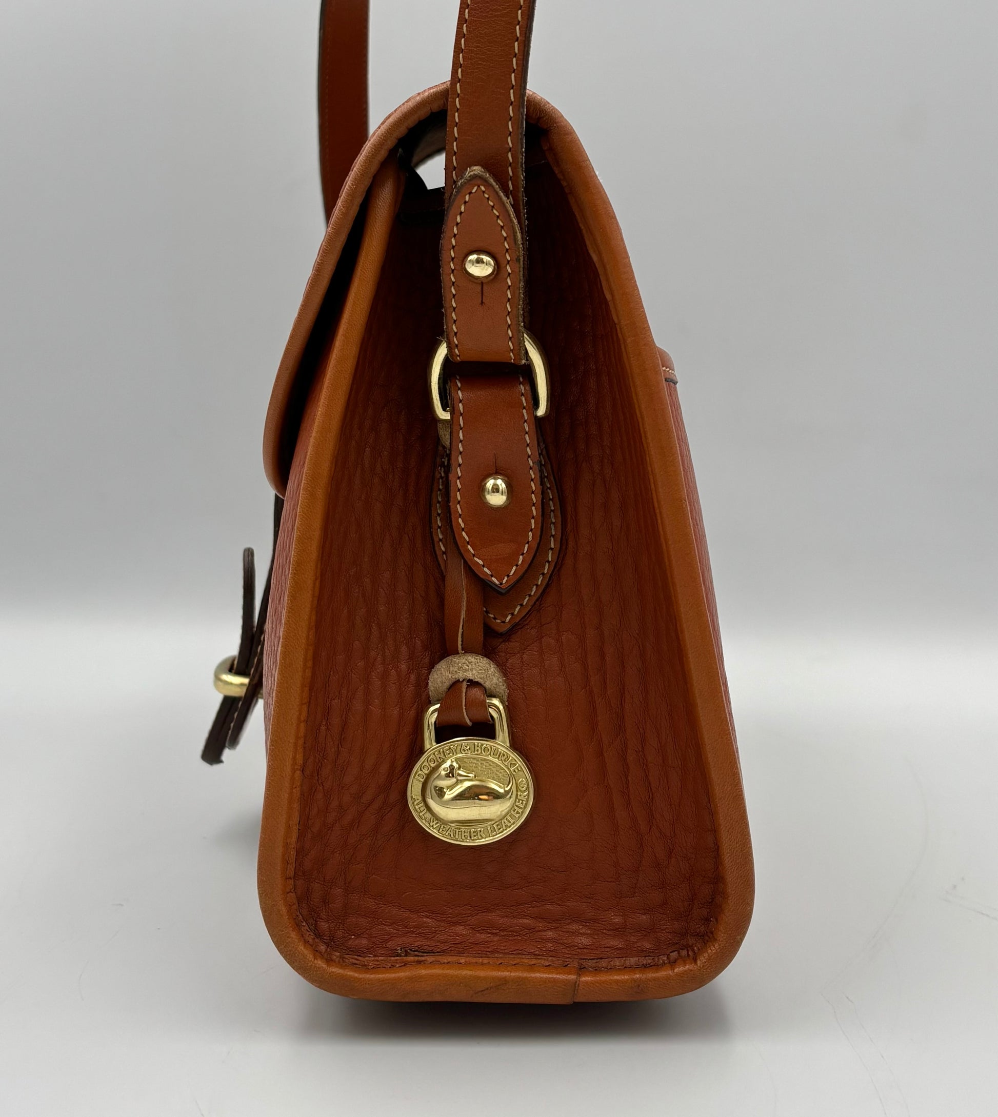 This authentic vintage Dooney & Bourke Essex Bag is crafted in thick saddle tan pebbled leather with British tan trim and solid brass hardware. The structured, dome-shaped silhouette features Dooney’s iconic duck logo, reinforced base with brass feet, and an adjustable buckle strap for shoulder or crossbody wear. A standout piece from the 1990s, it’s built to last and designed for daily use.